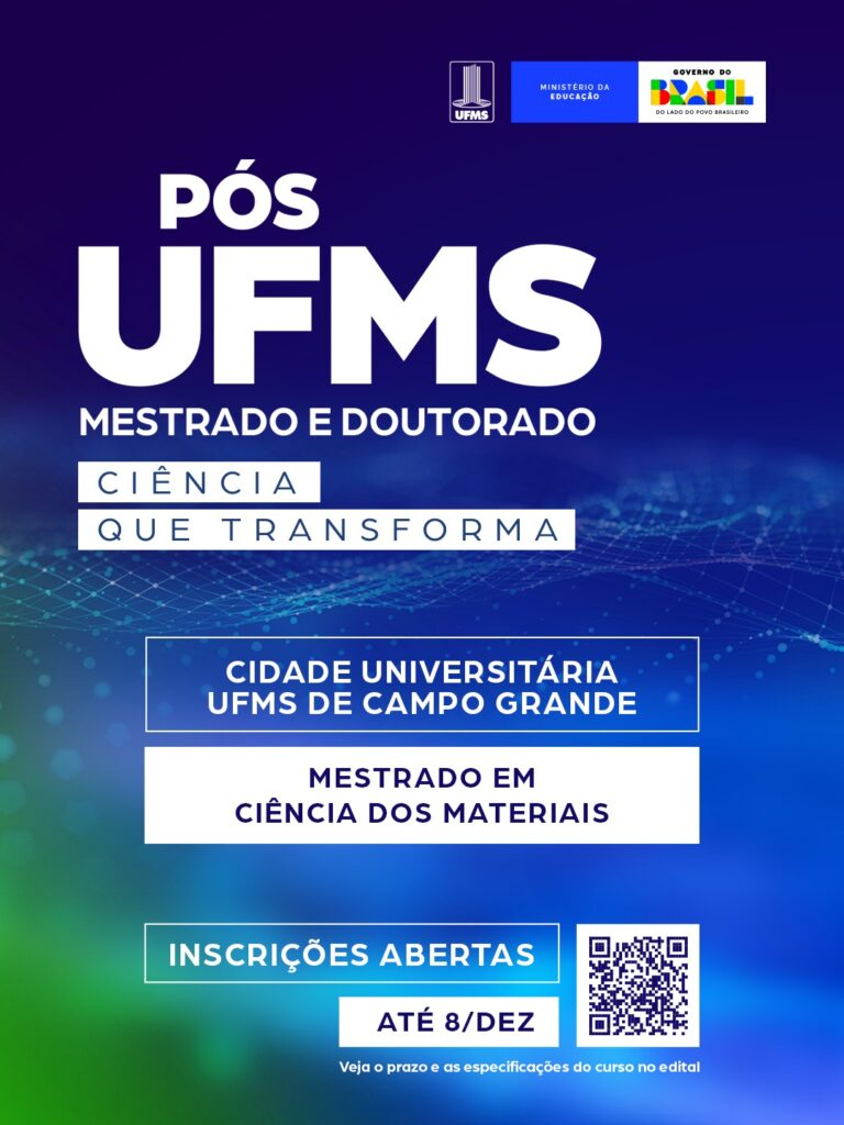 As inscrições para o curso de Ciência dos Materiais (Mestrado e Doutorado) serão gratuitas e poderão ser realizadas no período de 05/11 a 08/12/2025, através do link ingresso.ufms.br/mestradoedoutorado.